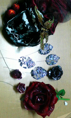 真ん中のラメラメ葉っぱはレースを切ってスプレーボンド振ってからラメつけてまたスプレーボンドつけて~って感じ。